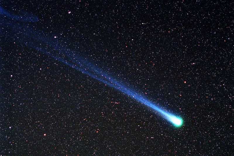 Кометы состоят из смесь льда, замерзшего газа и пыли. Они путешествуют вокруг Солнца по очень вытянутым орбитам. Когда комета приближается к Солнцу, лед и другие летучие вещества на ее поверхности быстро испаряются, образуется поток газа и пыли. Солнечный ветер и давление света «сдувают» образующиеся газы с другими веществами в сторону «от Солнца» Так формируется светящийся хвост кометы. Хвост кометы может достигать 10 млн км.