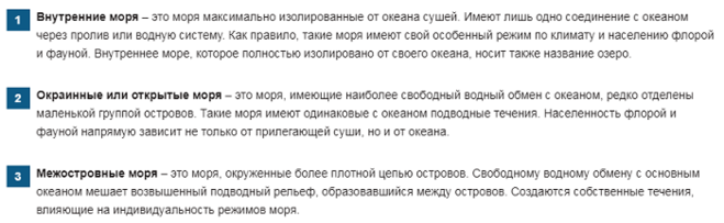 Степень обособленности стоит рассмотреть подробнее. В соответствии с ней моря делятся на 4 основных типа: