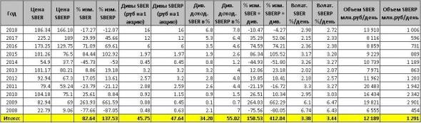В таблице 1 я проанализировал данные по торговле акций Сбербанка на МосБирже с 01.01.2008 и по 29.12.2018, т.е. за 11 полных лет.