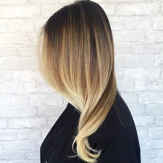 Один из новых видов окрашивания волос, при котором у корней цвет намного темнее, чем на концах. По своей сути эта техника близка к мелированию, но при ней осветляются не прядки, а делается градиент по длине волос. Более темный цвет у корней к кончикам становится все светлее и светлее. По правилам переход должен быть плавным, результат не должен напоминать отросшие темные корни брюнетки, которая красится в блондинку.