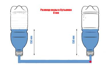 Из школьного урока физики о принципе соединяющихся сосудах знаем, что из бутылки, где уровень воды больше, жидкость постепенно перетечет в бутылку с более низким уровнем. Под воздействием потока воды шарик внутри соединяющего шланга будет перемещаться. Процесс перетекания завершится после того, как в обоих бутылках уровень жидкости уравновесится, станет одинаковым.