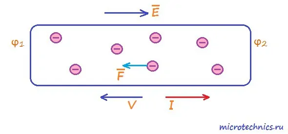 И поскольку электрон является отрицательно заряженной частицей, то вектор силы будет направлен в сторону противоположную направлению вектора напряженности поля. Таким образом, под действием силы частицы наряду с хаотичным движением приобретают и направленное (вектор скорости V на рисунке). В результате и возникает электрический ток.