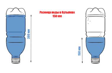 В первой бутылке вода находится на уровне 300 мм, а во второй – на отметке 150 мм. Разница между уровнями воды в обоих емкостях составляет 150 мм. Если рассматривать это с точки зрения науки об электричестве, это и есть разность потенциалов.