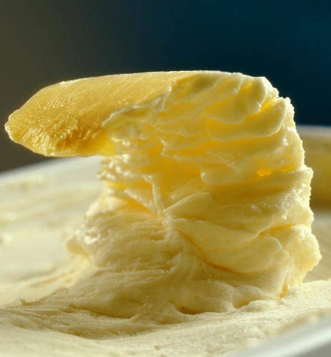 Сливочное масло – продукт животного происхождения с высоким содержанием жиров. Его получение происходит путём долгого взбивания сливок, пока они не образуют плотную, твёрдую консистенцию. При этом туда попадает воздух, продукт становится более лёгким. Правильное масло имеет не менее 72,5% жирности, а лучше – 82,5%. Одна чайная ложка продукта может содержать около 10 г холестерина. Также в нём есть витамин В, микроэлементы, такие, как железо, натрий, кальций, фосфор и др. Цвет оно имеет белый или желтоватый, в зависимости от исходного сырья. Употреблять его можно, просто съев кусочек, намазав на хлеб, добавив в блюдо, а также при выпекании и жарке.