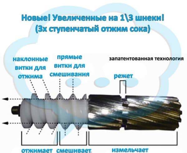Шнек является самой важной частью аппарата. От него зависит качество отжима продуктов и сохранение всех полезных веществ