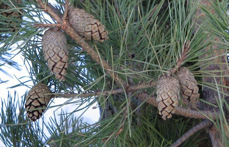 Ветки молодого дерева образуют правильный геометрический конус, со временем крона постепенно приобретает вид ассиметричного зонтика. Чешуйчатая кора с глубокими трещинами имеет толщину больше 1 см. Так природа предусмотрела защиту дерева от перепада температуры и палящего солнца. Сдвоенные хвоинки, длиной 5 – 9 мм, густо расположены на одномутовчатых побегах. Созревание семян происходит на второй год после опыления.