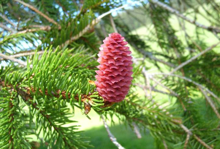 Женские шишки ели значительно больше, чем мужские. Их легко удается идентифицировать по насыщенному красному оттенку. Такие шишки тоже располагаются на концах веток, однако они находятся вверху кроны. При этом для мужских еловых шишек не характерен насыщенный окрас и крупные размеры.