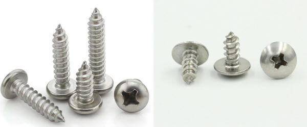 Саморезы с полукруглой головкой, переходящей в шайбу, используют для соединения материалов имеющих форму листа. Такой крепеж для листового металла имеет резьбу с малым шагом. При этом форма головки увеличенного диаметра дает возможность более эффективно крепить материал за счет усиления прижимания к основанию, когда просто невозможно сделать зенковку.