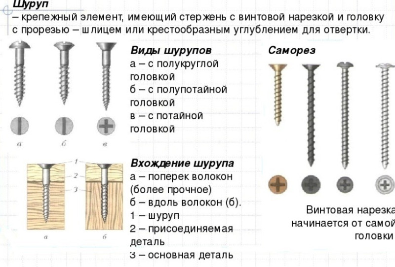 Шуруп и саморез являются крепежными изделиями, представляющими собой стержень с головкой и наружной резьбой. В некоторых источниках считается, что саморез является разновидностью шурупа. Функциональная характеристика этого изделия – создание внутренней резьбы в отверстии соединяемого предмета.