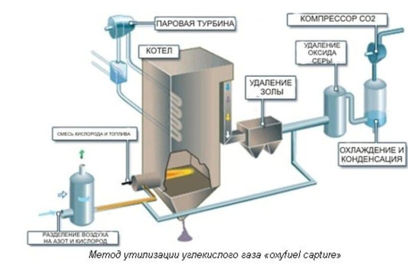 При его применении используют чистый кислород, все примеси удаляются. После сжигания топлива создается пар, дающий ход валу и турбине. А из дымовых газов убирают оксиды серы и золу, следом проводится остужение и превращение в жидкое состояние. Углекислый газ, который остался после данной процедуры, также трансформируется под большим давлением в жидкое состояние и закрывается глубоко под землей.