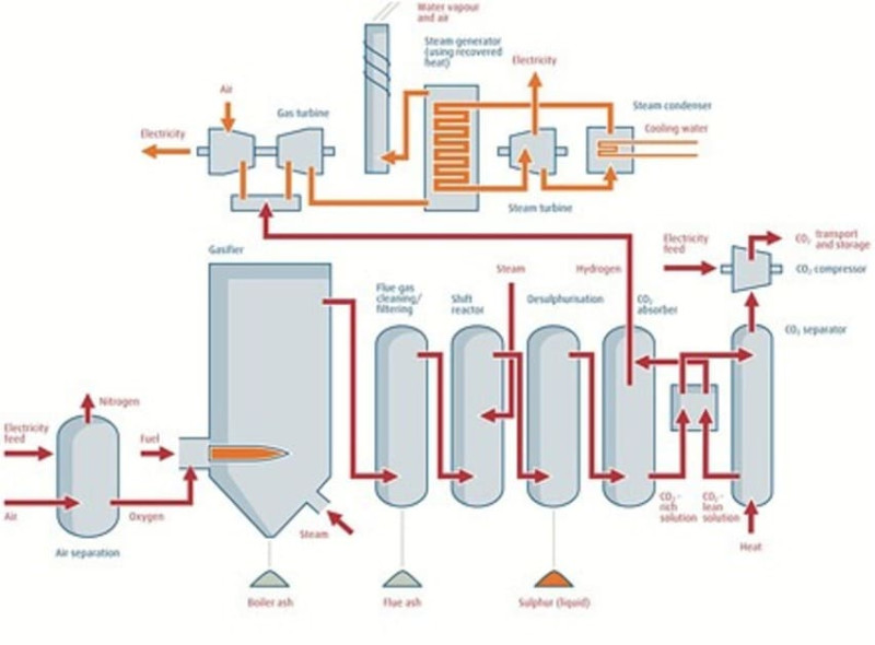 Затем выполняют череду химических преобразований, приводящих к появлению водорода, что сгорает в газовой турбине и углекислого газа. После изъятия золы и оксида серы, CO2 усваивается жидким абсорбентом, а затем удаляется и утилизируется.