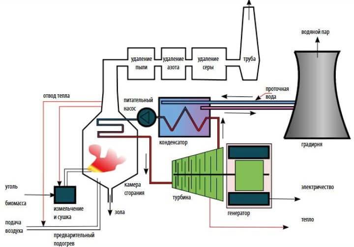 Тепловые электростанции, которые применяют в качестве топлива уголь (и угольную пыль), загружают топливо в специальный котел и далее идет процесс горения – выработки пара – получения электроэнергии.