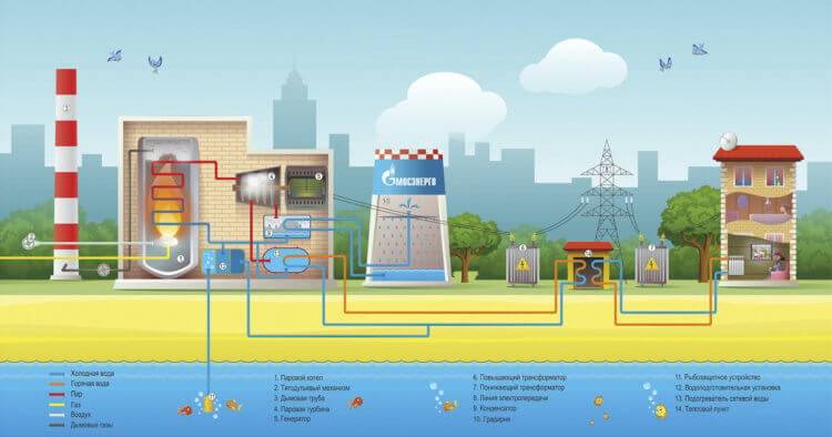 Казалось бы, что на этом надо заканчивать, ”заправлять” в котлы новый уголь и подливать воду, но не все так просто. На этапе турбины у потерявшего свою силу и остывшего пара есть два пути. Первый — в циклическую систему повторного использования, второй — в магистраль теплоснабжения. Нагревать воду для отопления отдельно нет смысла. Куда проще отобрать ее после того, как она приняла участие в выработке электричества. Так получается намного эффективнее.