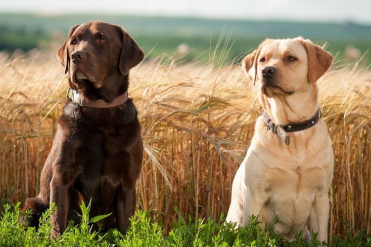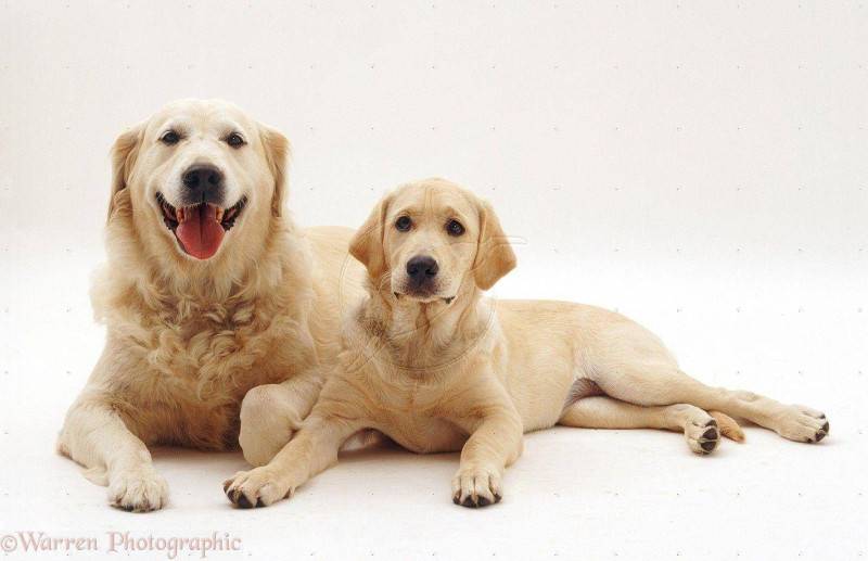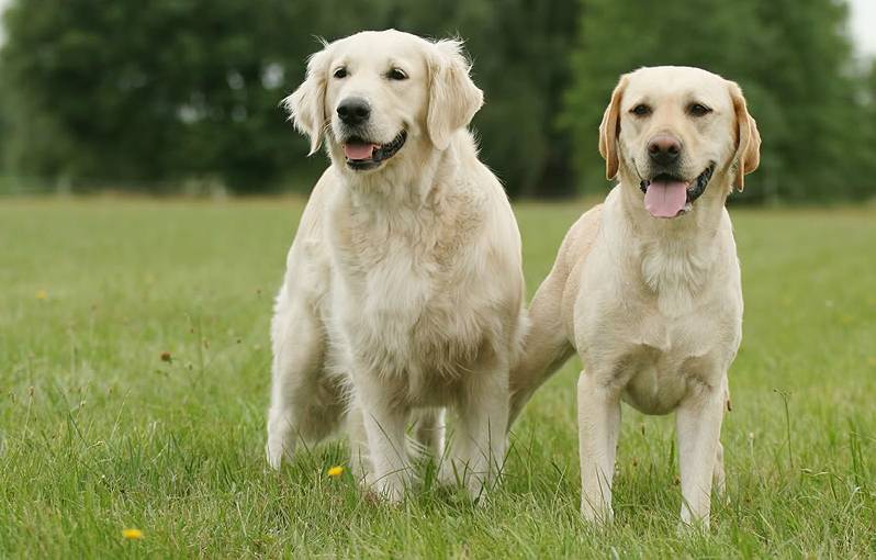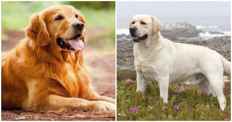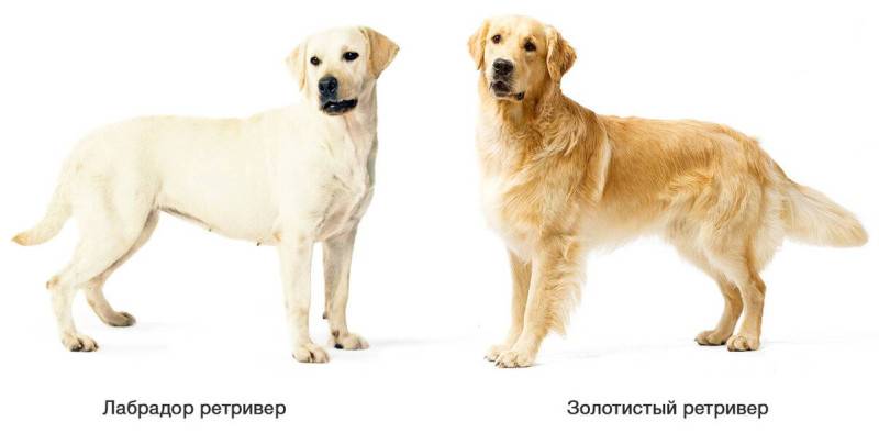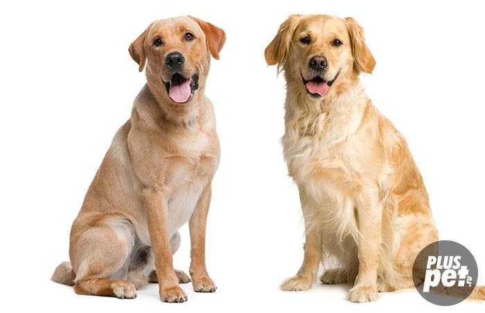 Голден-ретриверы бывают только золотистыми. Их мягкая шёрстка может иметь любой оттенок: светло-палевый, кремовый, бежевый, опаловый и др. Встречаются и более редкие виды — махагоновый и ярко-рыжий. Лабрадоры могут иметь несколько вариантов окраса: