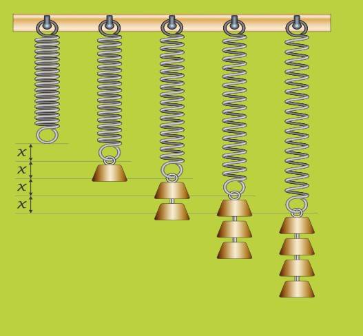 Пример: на рисунке ниже видно растяжение (удлинение) пружины после того, как на нее подвесили груз. Причем чем тяжелее груз и, соответственно, большая сила прилагается, тем сильнее растягивается пружина.