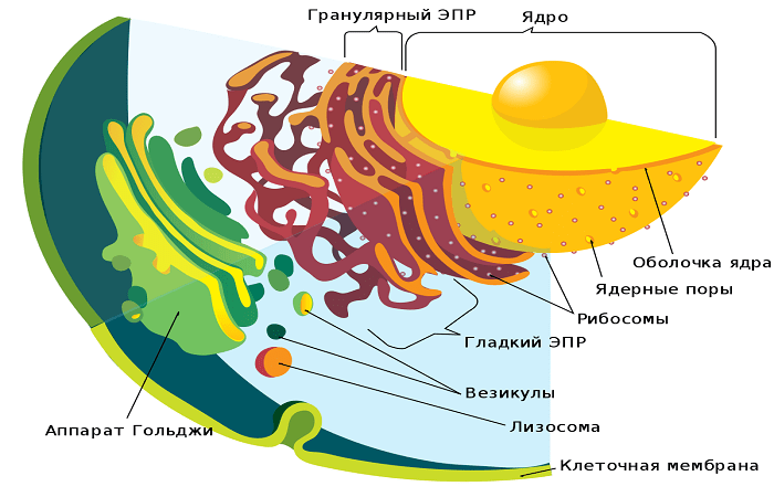 Эндоплазматическая сеть. Она бывает шероховатой, на ней идёт биосинтез белка. Жиры и углеводы синтезируются на гладкой сети.
