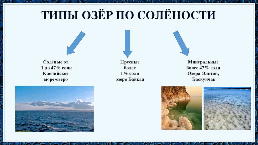 Озера могут быть пресными или солеными. Пресными называются озера, вода которых не содержит солей и подходит для питья. Соленость озер может варьироваться в зависимости от их географического положения и наличия источников соли, таких как солончаки или морская вода.