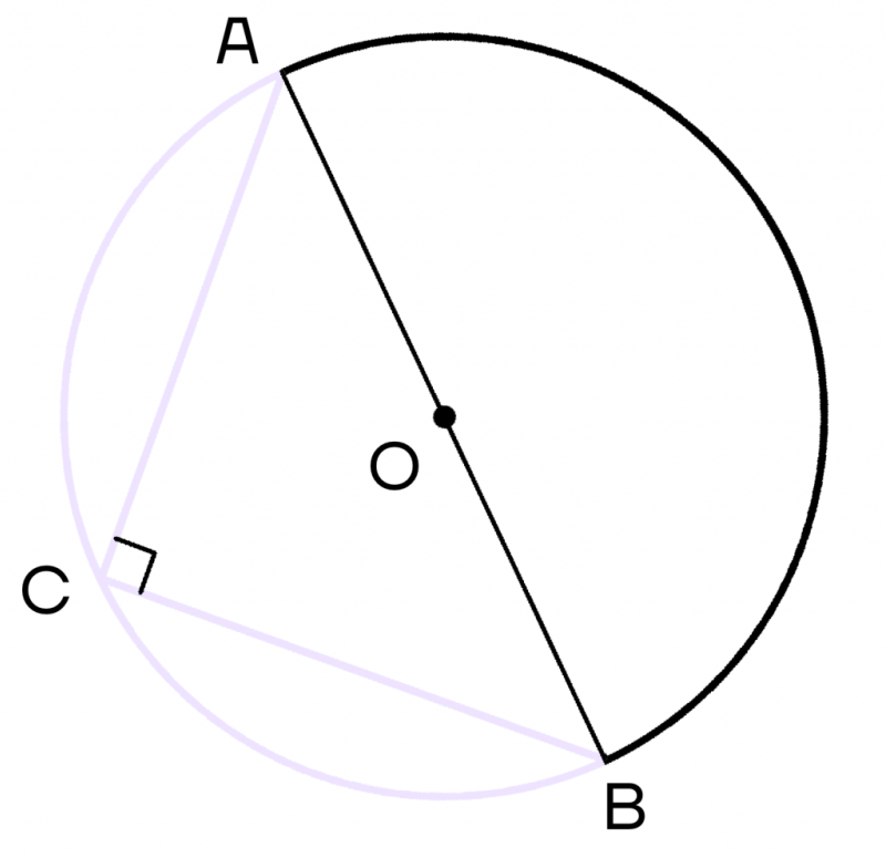 Вспомним, что диаметр делит окружность на две полуокружности, градусные меры которых равны 180\(\circ\). Тогда вписанный угол будет равняться 180\(\circ\) : 2 = 90\(\circ\).