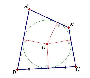Если в выпуклый четырехугольник вписана окружность, то суммы длин противоположных сторон равны. Обратно: если в выпуклом четырехугольнике суммы длин противоположных сторон равны, то в четырехугольник можно вписать окружность: