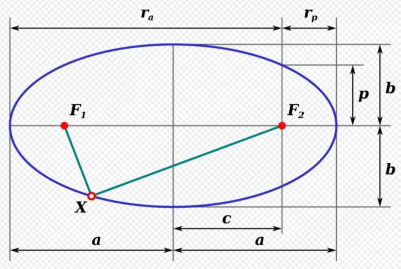 Где а — это длинная полуось, b — короткая, а с — фокальное расстояние (от центра до фокуса).