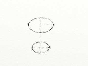 С помощью визирования определяем размер овалов. Откладываем этот размер с помощью карандаша, отмечаем одинаковые отрезки от точки пересечения центровых линий. Откладываем точки ширины овалов. Отмечая эти размеры не забываем о правилах перспективы: та сторона овала, что дальше от нас — будет чуточку меньше, значит та, что ближе к нам — больше. Точно также помним, чем ниже уровня глаз находится овал, тем сильнее ему хочется стать кругом. |