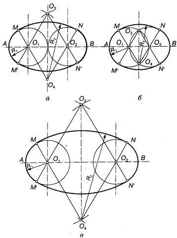 – это замкнутая коробовая кривая, имеющая две оси симметрии и состоящая из двух опорных окружностей одинакового диаметра, внутренне сопряженных дугами (рис. 13.45). Овал характеризуется тремя параметрами: длина, ширина и радиус овала. Иногда задают только длину и ширину овала, не определяя его радиусов, тогда задача построения овала имеет большое множество решений (см. рис. 13.45, а…г).