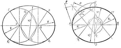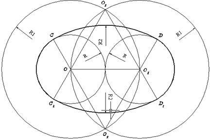 Рассмотрим первый случай. Строят отрезок OO 1 =2R, параллельный оси Х, на его концах (точки О и О 1) размещают центры двух опорных окружностей радиуса R и центры двух вспомогательных окружностей радиуса R 1 =2R. Из точек пересечения вспомогательных окружностей О 2 и О 3 строят дуги CD и C 1 D 1 соответственно. Удаляют вспомогательные окружности, затем относительно дуг CD и C 1 D 1 обрезают внутренние части опорных окружностей. На рисунке ъъъ полученный овал выделен толстой линией.