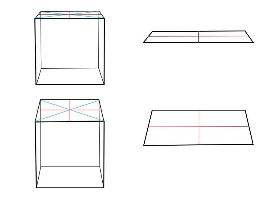 Соблюдая правила перспективы, дальняя часть овала рисуется меньше (красная линия), ближняя к зрителю — больше (синяя линия на рисунке).