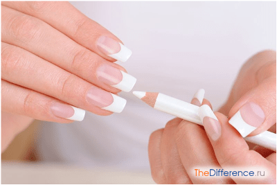 Карандаш изготавливают на основе мела или глины, поэтому он укрепляет и восстанавливает ногтевую пластину. Можно убрать им желтизну, вычистить грязь и выбелить ногти. Для этого необходимо заточить стержень карандаша, намочить его и несколько раз провести снизу по выступающей части ногтя.