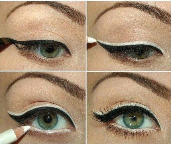 - те, у кого большие округленнее глаза, могут зрительно удлинить их, нанеся белую подводку на внутренние уголки;