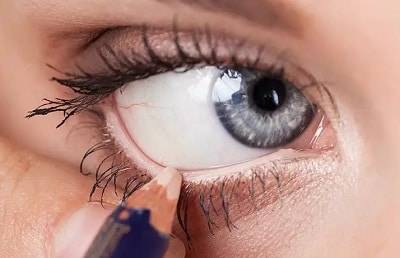 Обозначают четкую полоску внутри нижнего века, а после этого проходятся под ней черным карандашом.
