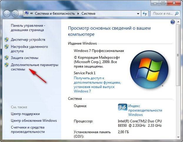 Выбираем — «Мой компьютер» — «свойства». Далее слева находим строку «дополнительные параметры» — выбираем её:
