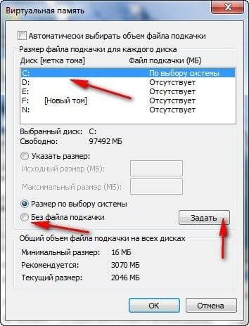- В настройках виртуальной памяти Виндовс отключается файл подкачки для диска, где он находится. Выбирается «Без файла подкачки» и щелкнуть по «Задать».