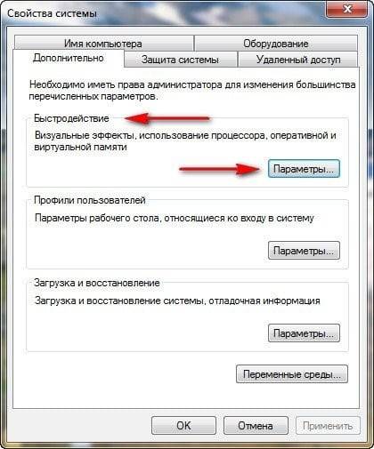 Далее на вкладке «Дополнительно» выбираем «Параметры». В новом окне переходим на вкладку «Дополнительно», там выбираем «Изменить»: