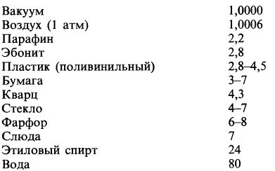 Диэлектрическая проницаемость — эта величина зависит от типа диэлектрика, который находится между обкладками конденсатора. Например, для воздуха и вакуума это значение равняется 1, для некоторых других веществ можете посмотреть в таблице.