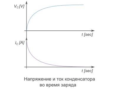При подключении к источнику питания в самом начале ток зарядки будет иметь максимальное значение. Однако, по мере того, как заряд накапливается, наблюдается постепенное уменьшение тока, который полностью пропадает при полном заряде. Напряжение во время зарядки, наоборот, увеличивается и по окончании процесса становится равным напряжению в источнике питания.