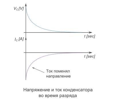 В случае подключения нагрузки при отключенном источнике питания, конденсатор сам становится источником тока. В этот момент, между пластинами происходит образование цепи. Через нагрузку происходит движение отрицательно заряженных электронов к ионам, обладающим положительным зарядом. В данном случае, вступает в силу закон притяжения разноименных зарядов. При прохождении тока через нагрузку происходит постепенная потеря заряда и, в конечном итоге, разрядка конденсатора. Одновременно, снижается напряжение и ток. Процесс разрядки считается завершенным, когда напряжение на электродах будет равным нулю.