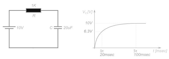 Продукт RC (сопротивление, умноженное на емкость) формирует временную константу ? (тау). За один ? конденсатор заряжается или разряжается на 63%. За пять ? конденсатор заряжается или разряжается полностью.