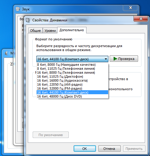 Обратите внимание на то, что в настройках аудио операционной системы Windows Вы устанавливаете разрешение (в смысле, точность) аудио: частоту дискретизации 44,1 кГц или 96 кГц (sample rate) и битовую разрядность (bit depth). Выбираете одну-единственную из всего множества имеющихся