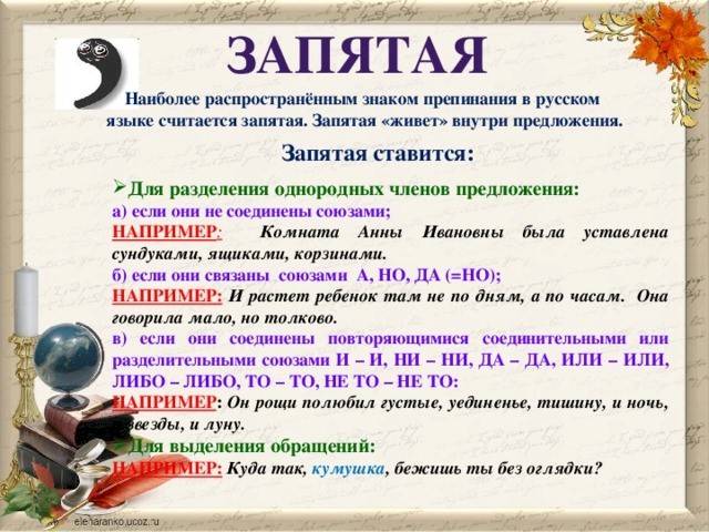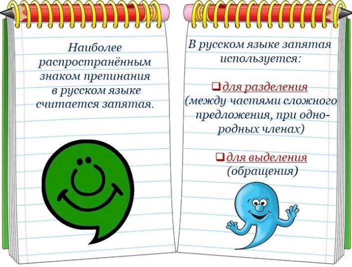 | Запятая | , | разделение однородных членов предложения (перечисление); разделение частей сложного предложения; выделение обращения | перечислительная пауза; выделительная пауза |