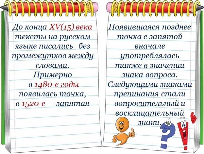 - Возникновение печатных книг. В XV−XVI веках начали печатать первые книги, с чем и связана потребность в знаках препинания. Запятая появилась в XV столетии, а привычный современному человеку вопросительный знак передавался сочетанием символов точки и запятой. Позднее он приобрел свой обычный вид и стал использоваться наравне с восклицательным, скобками, а в 17-м веке появилось и двоеточие.