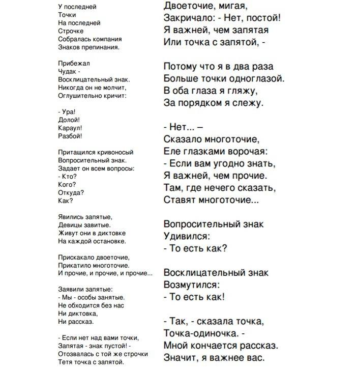 Чтобы заинтересовать детей, можно прочитать стих о знаках препинания С. Я. Маршака. В нем точки с запятыми спорят, кто из них важнее.
