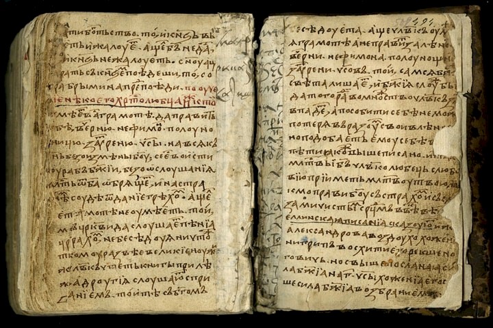 - Рукописные тексты XI столетия. Представляют собой книги без пробелов. Заглавные буквы в них отсутствуют, но сам текст начинается с красиво оформленной буквицы — исполненной красным цветом первой буквы первого слова. Читать такие произведения довольно сложно. Адаптировать их к современному виду также весьма проблематично, с чем и связано большое количество ошибок и неточностей, ряд которых были выявлены позднее. В этот период использовались только точки, но ставились они не в конце предложения, обозначая его завершение, а над словами, привнося дополнительный смысл. Например, 4 точки обозначали крест.
