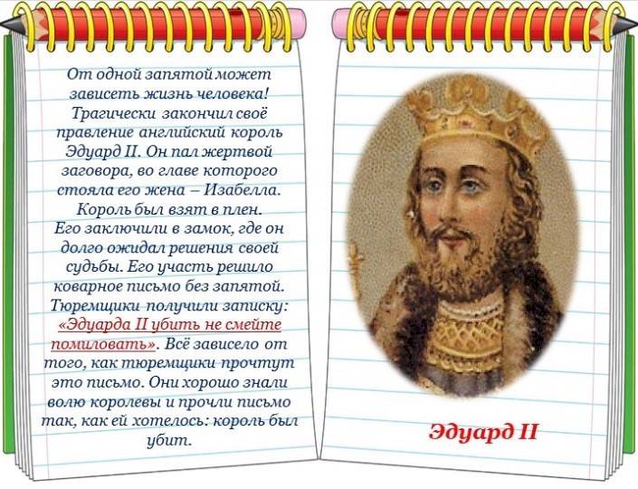 Если взять знаменитую фразу «казнить нельзя помиловать», то от того где поставить запятую, может решиться жизнь человека. Либо человека казнят, и жизнь будет прервана, либо помилуют, и он будет жить. Вот так одна маленькая запятая способна решить многое. Так же запятые выполняют обособляющую, выделяющую и разделительную роль. Запятая как передышка перед дальнейшим повествованием.
