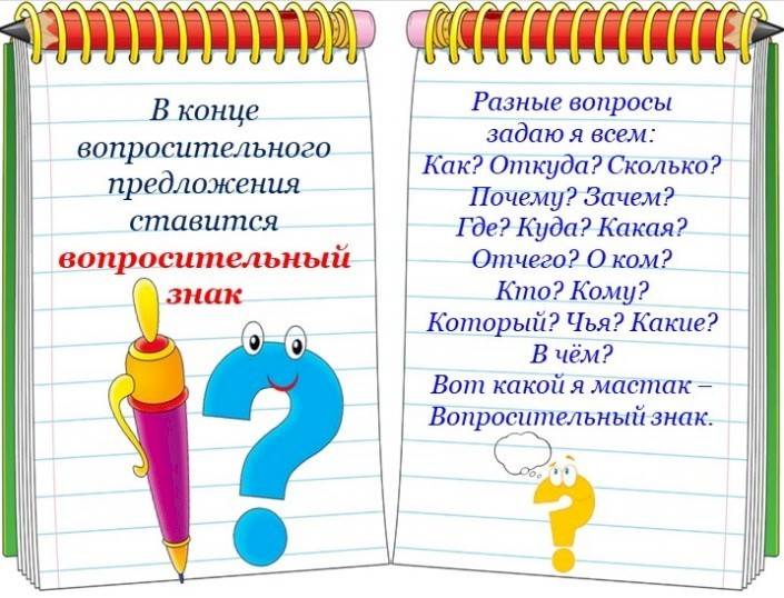 | Вопросительный знак | ? | в предложении звучит вопрос | вопросительная |