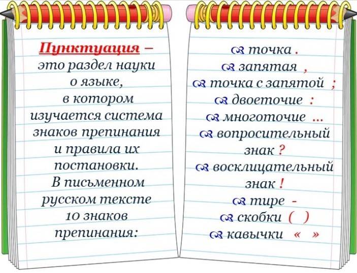 Сейчас в русской пунктуации есть 10 знаков: точка, запятая, точка с запятой, двоеточие, многоточие, знаки вопроса и восклицания, тире, кавычки, скобки.