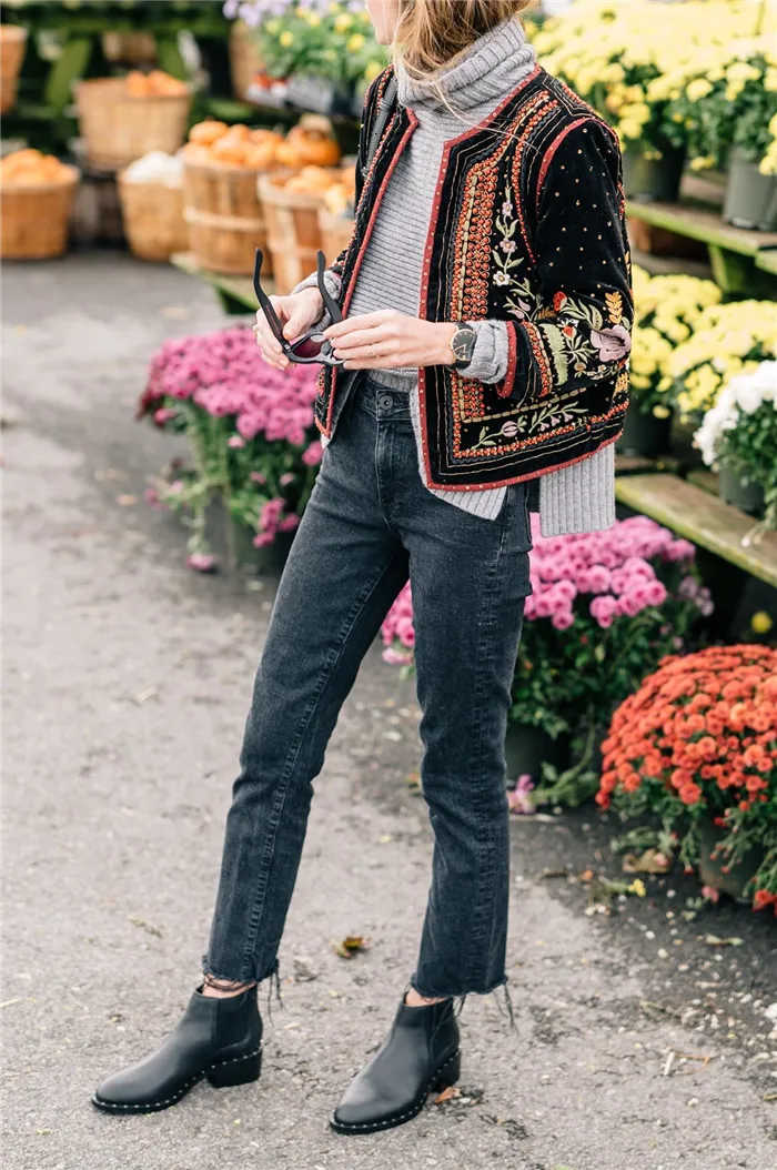 Черные куртки с яркими декоративными элементами созданы для атмосферной осени. Сочетайте его с серым джемпером и темными джинсами для создания необработанного образа. Лаконичный Chelsea с лаком для ногтей поддерживает общее практичное настроение. Чтобы весь образ выглядел гармонично, следует предусмотреть небольшую стеганую сумку.