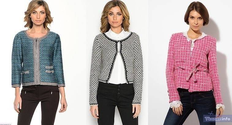 Популярный жакет в стиле Шанель – это модель с круглым вырезом без воротника. Есть так же жакеты с овальным, треугольным или прямоугольным вырезом. Модели спортивного стиля выпускаются, как с воротником, так и с капюшоном. Последний вариант очень удобен для осени, так как вполне может заменить плащ. Причем к такому образцу не потребуется подбирать головной убор, капюшон защитит от дождя и ветра.